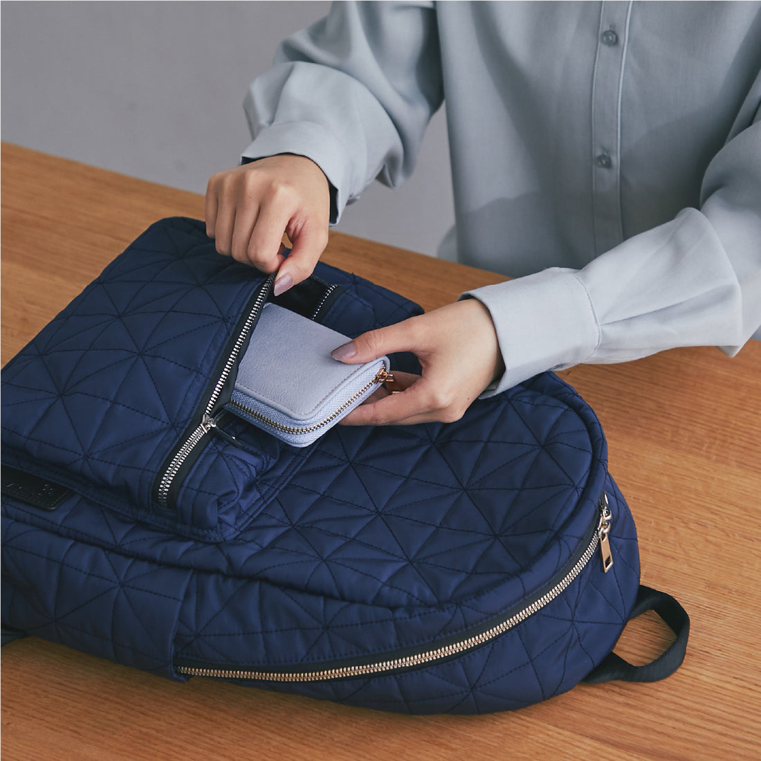 大きなセンターポケットには、三つ折り財布など厚みのあるものも入ります。デザインのポイントにも。