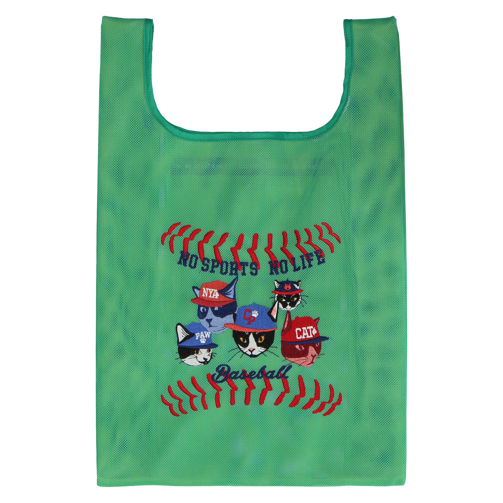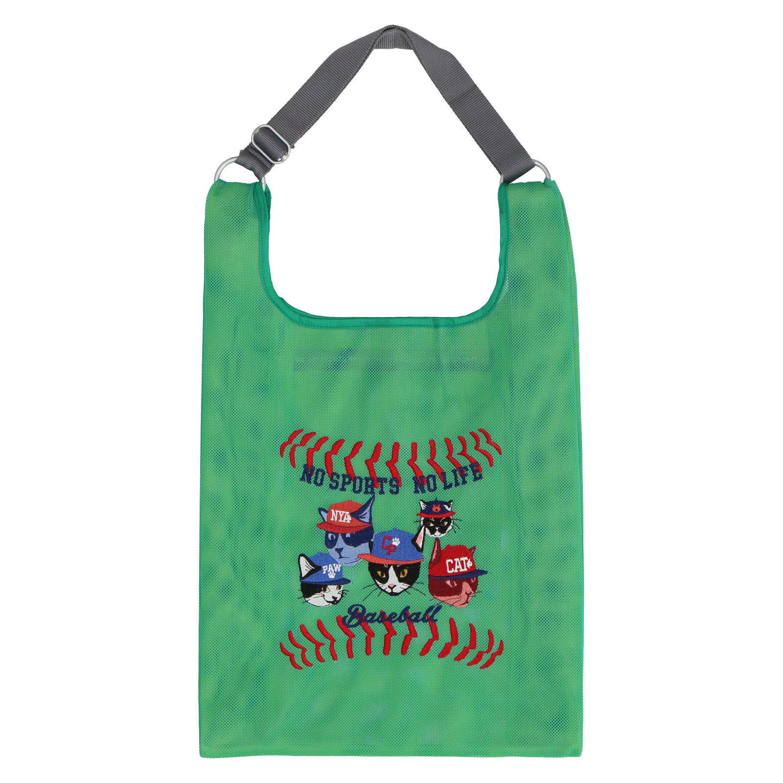 2色重なるメッシュ生地は、中と外で色が違い、楽しい色使いとなっています。 メッシュバッグは、スポーツ種目30柄でデザインされており、刺繍で表現されています。 スポーツを楽しむネコたちとともに元気よくスポーツを楽しもう!