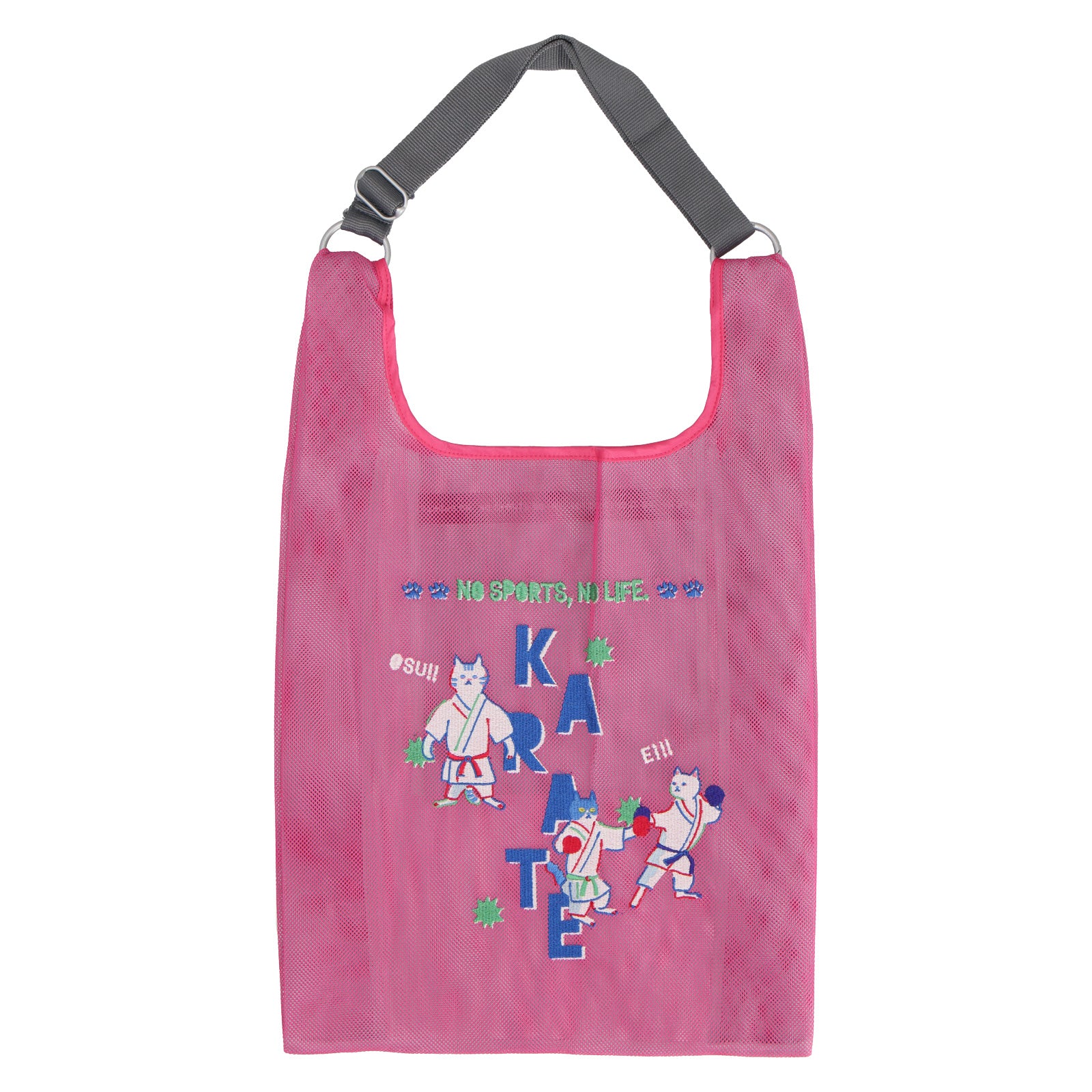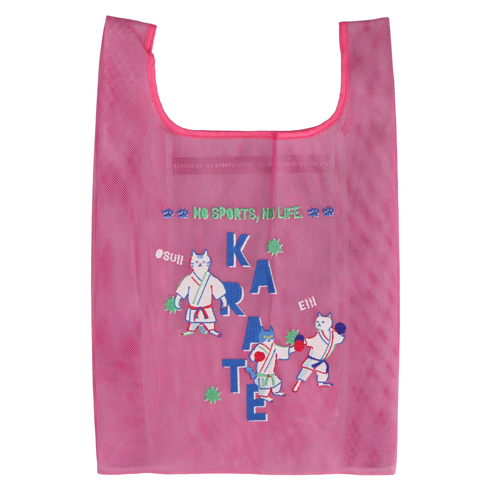 2色重なるメッシュ生地は、中と外で色が違い、楽しい色使いとなっています。 メッシュバッグは、スポーツ種目30柄でデザインされており、刺繍で表現されています。 スポーツを楽しむネコたちとともに元気よくスポーツを楽しもう!