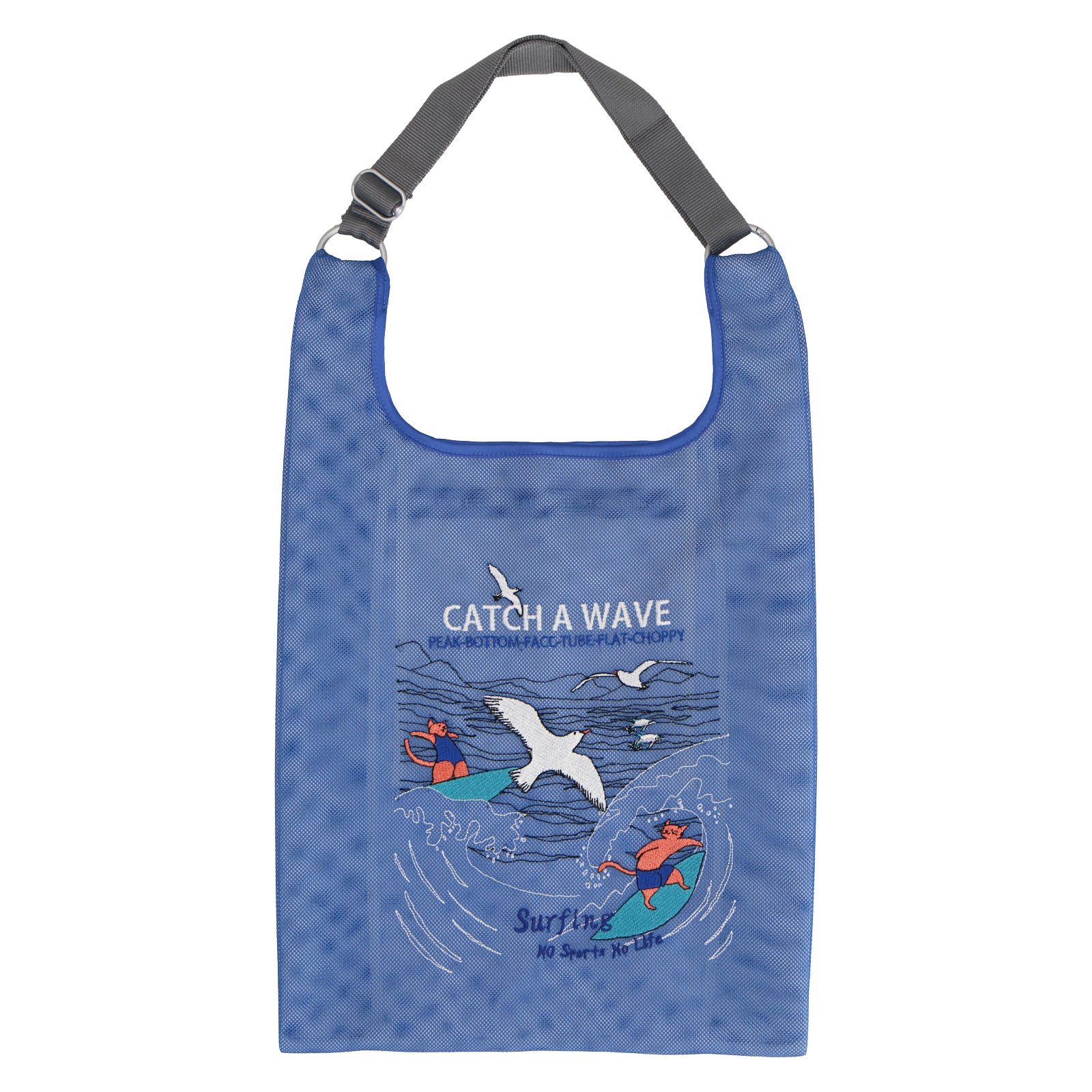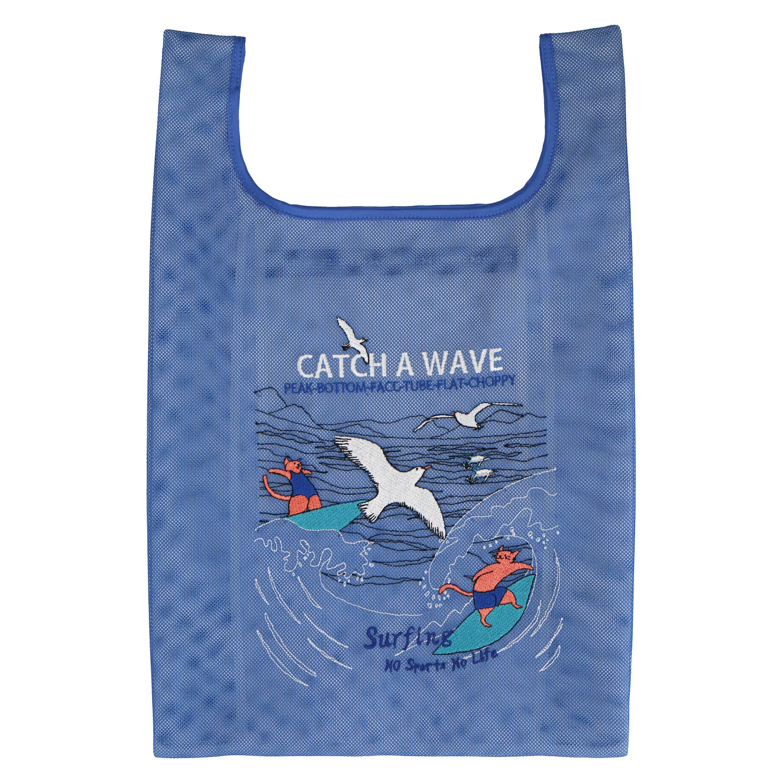 2色重なるメッシュ生地は、中と外で色が違い、楽しい色使いとなっています。 メッシュバッグは、スポーツ種目30柄でデザインされており、刺繍で表現されています。 スポーツを楽しむネコたちとともに元気よくスポーツを楽しもう!