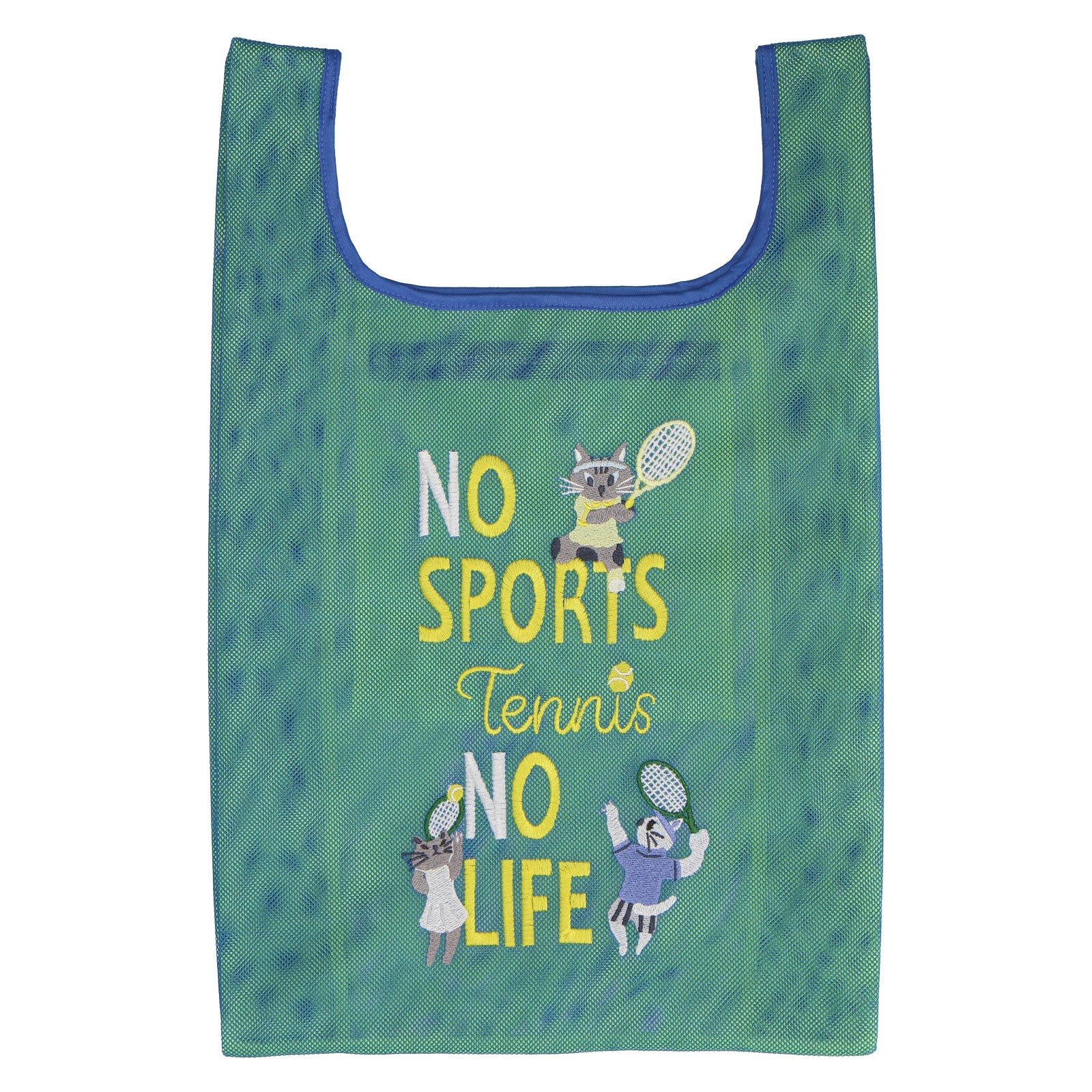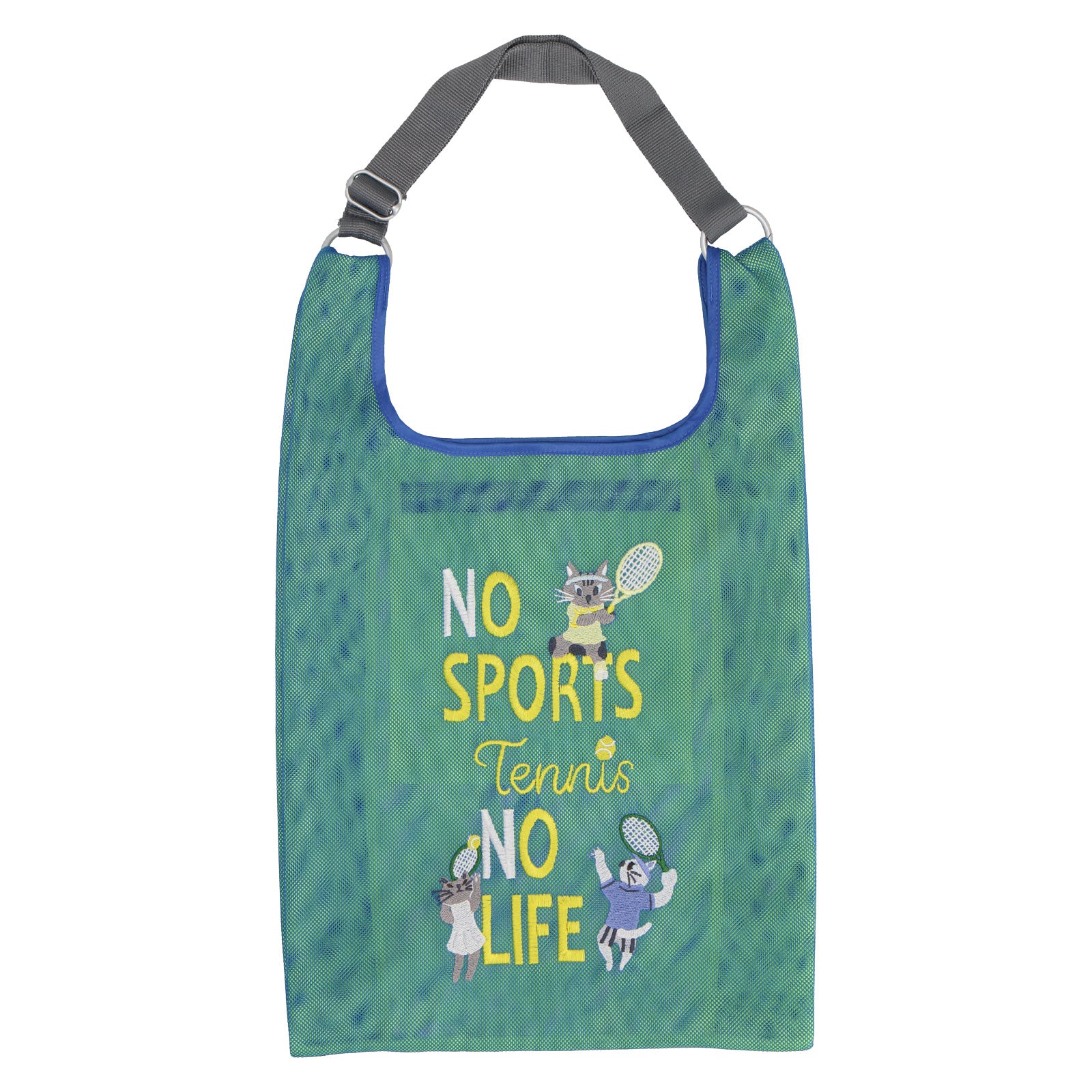 2色重なるメッシュ生地は、中と外で色が違い、楽しい色使いとなっています。 メッシュバッグは、スポーツ種目30柄でデザインされており、刺繍で表現されています。 スポーツを楽しむネコたちとともに元気よくスポーツを楽しもう!