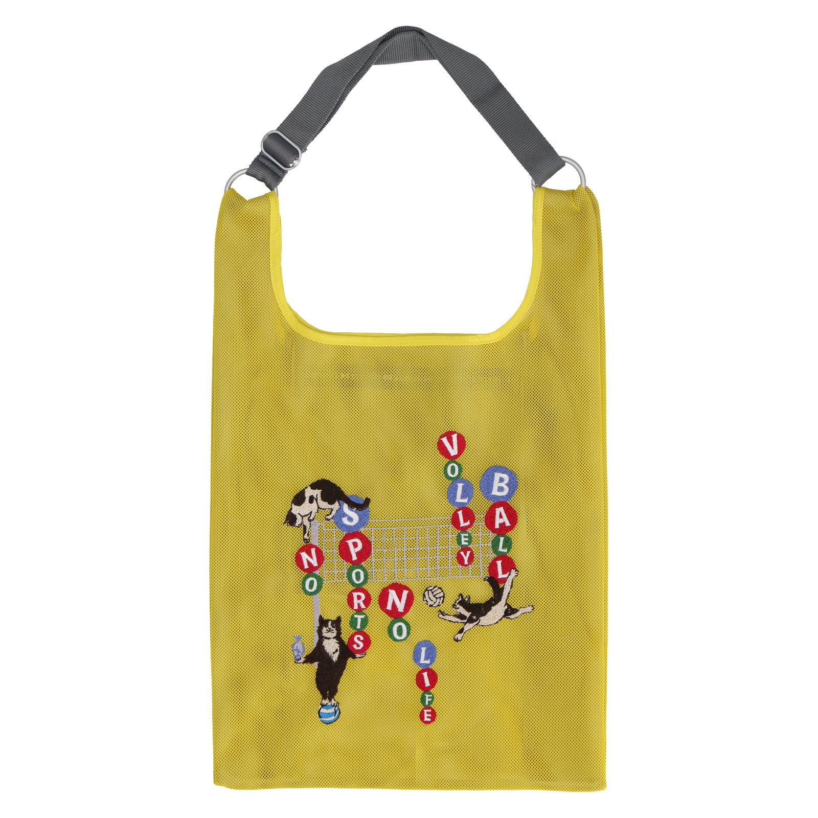 2色重なるメッシュ生地は、中と外で色が違い、楽しい色使いとなっています。 メッシュバッグは、スポーツ種目30柄でデザインされており、刺繍で表現されています。 スポーツを楽しむネコたちとともに元気よくスポーツを楽しもう!
