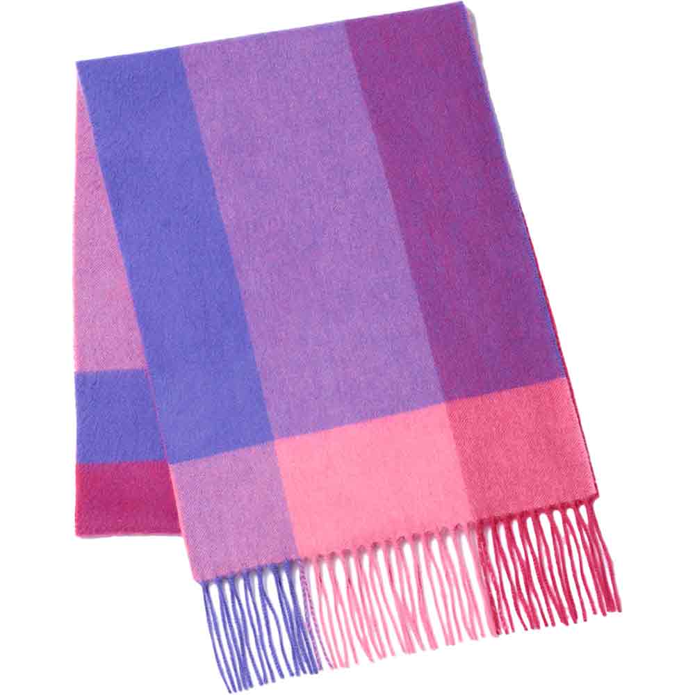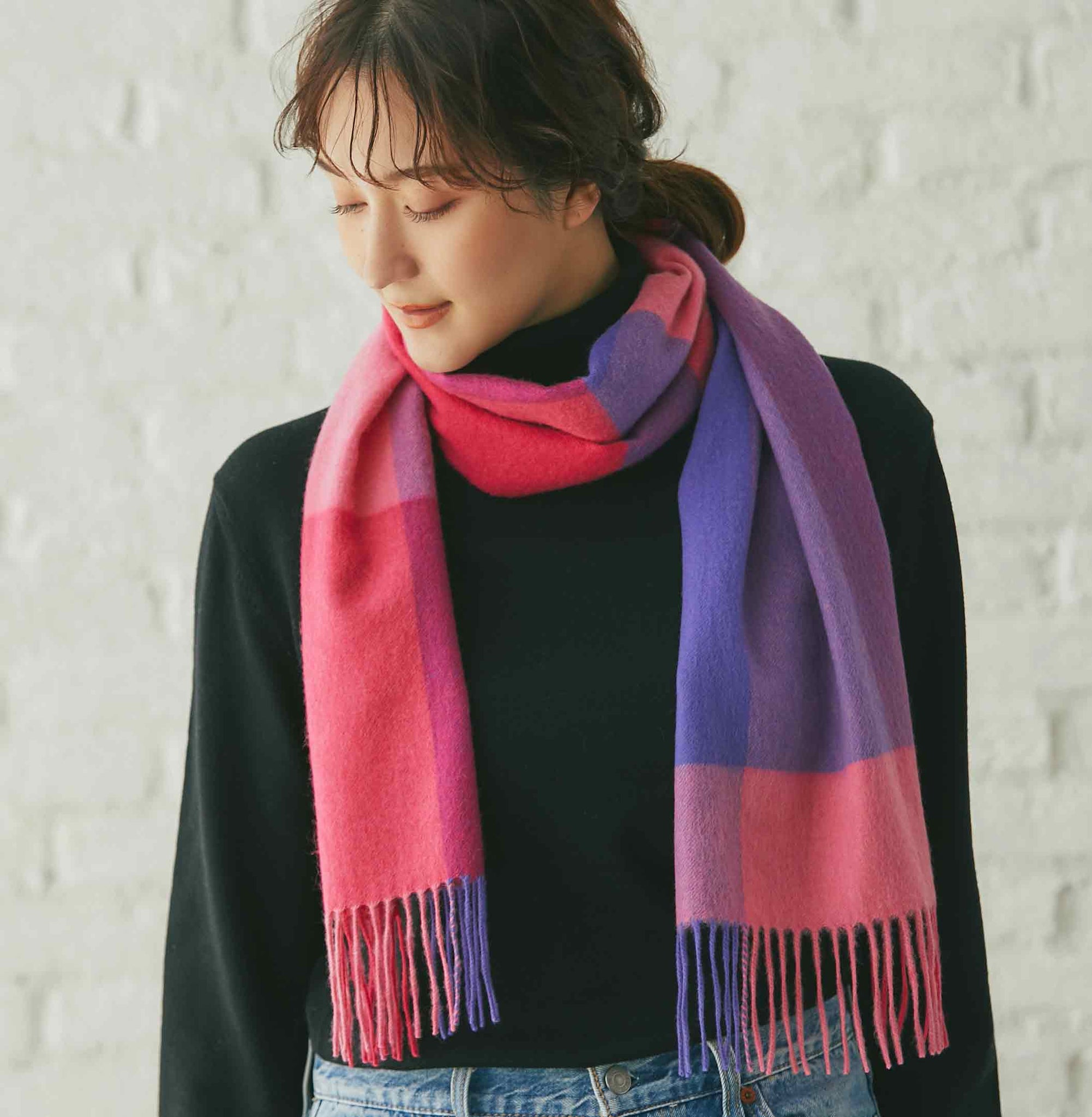 3色の糸を組み合わせて多数のカラーを表現したブロック柄マフラーです。さまざまなブロックによるカラー表現でお洋服のスタイリングに華やかさをプラスします。