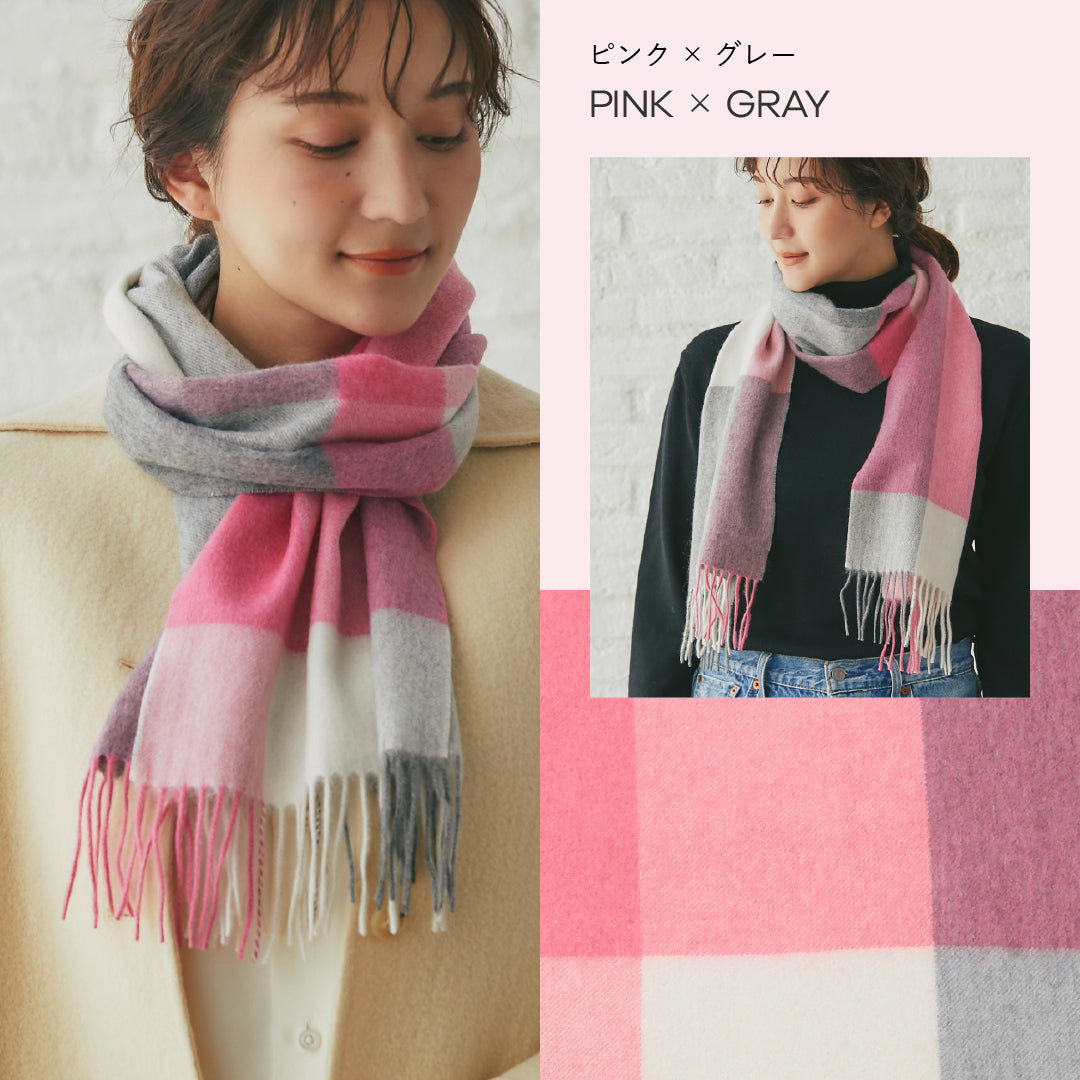 3色の糸を組み合わせて多数のカラーを表現したブロック柄マフラーです。さまざまなブロックによるカラー表現でお洋服のスタイリングに華やかさをプラスします。